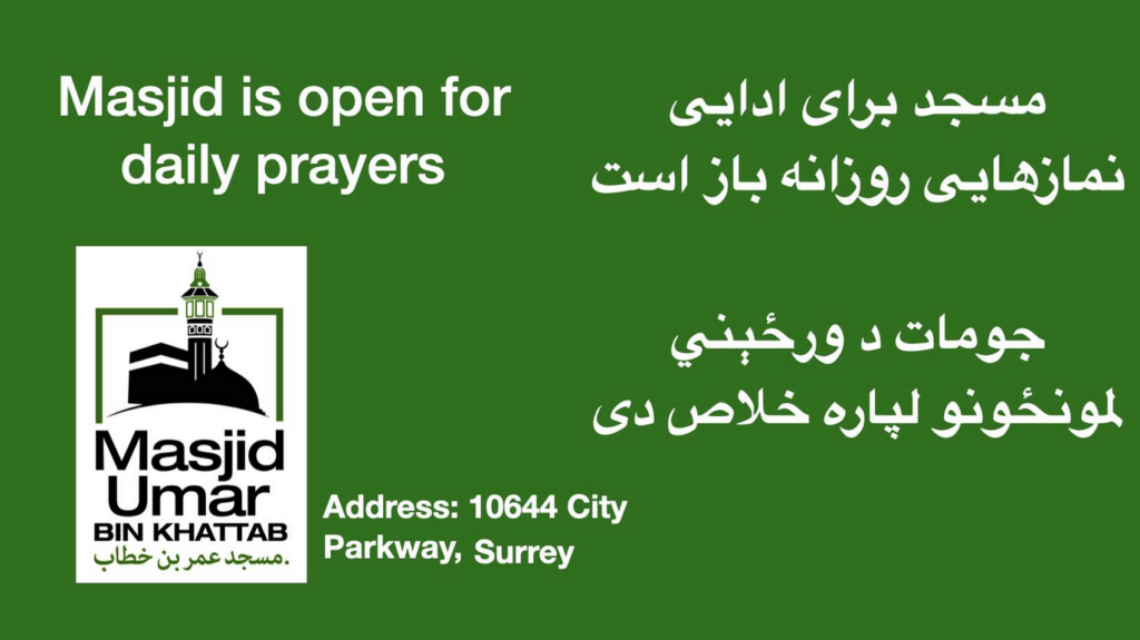 Masjid Umar Bin Khattab is open everyday for daily prayers of Zuhr, Asr, and Maghrib.Dear community members, please be informed and help share this message