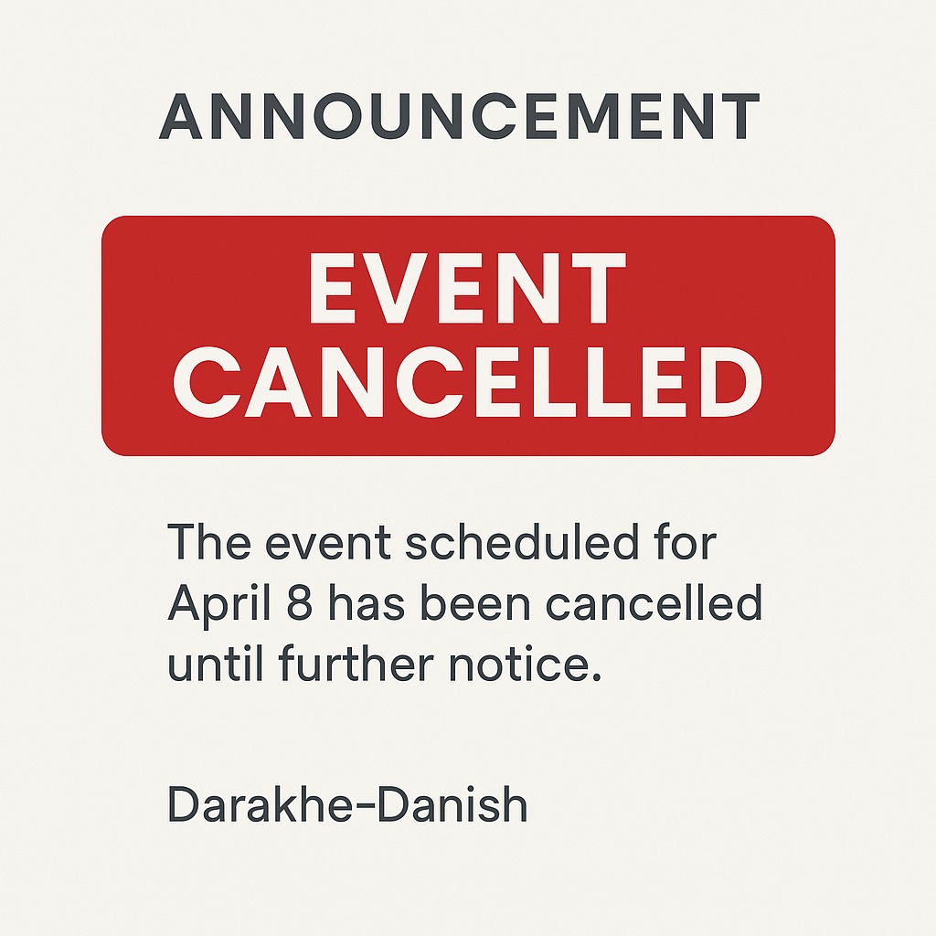 Announcement from Darakhe-Danish The event that was scheduled for April 8 has been cancelled until further notice.Please stay tuned for updates, and thank you for