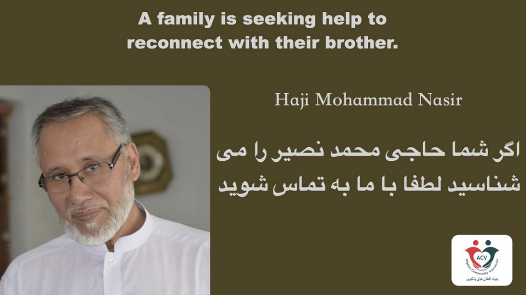 اطلاعیه مهم کمیونیتی افغانهایی ونکوور یک خانواده از افغانستان در جستجوی برادر شان به نام حاجی محمد نصیر میباشد که گفته میشود درسه دهه گذشته