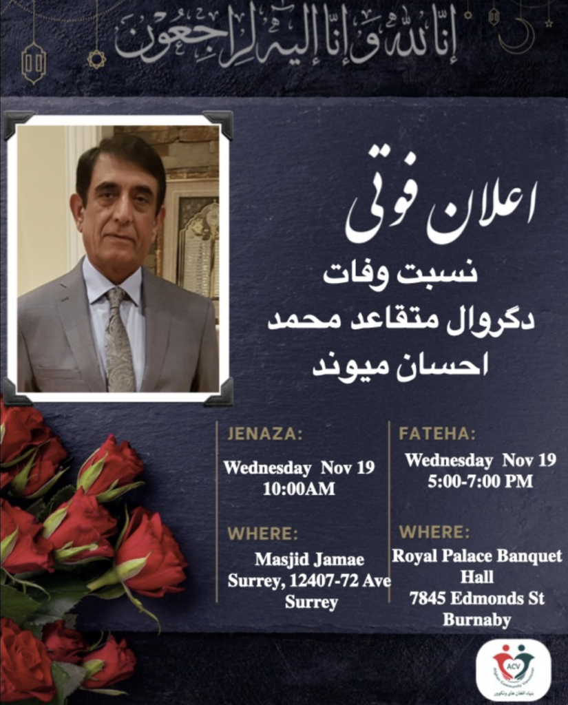 پیام کمیونیتی افغانهای ونکوور اعلان فوتی با تأثر و تأسف فراوان به اطلاع دوستان، آشنایان و هموطنان عزیز رسانیده میشود که:دگروال متقاعد محمد احسان میوندسابق