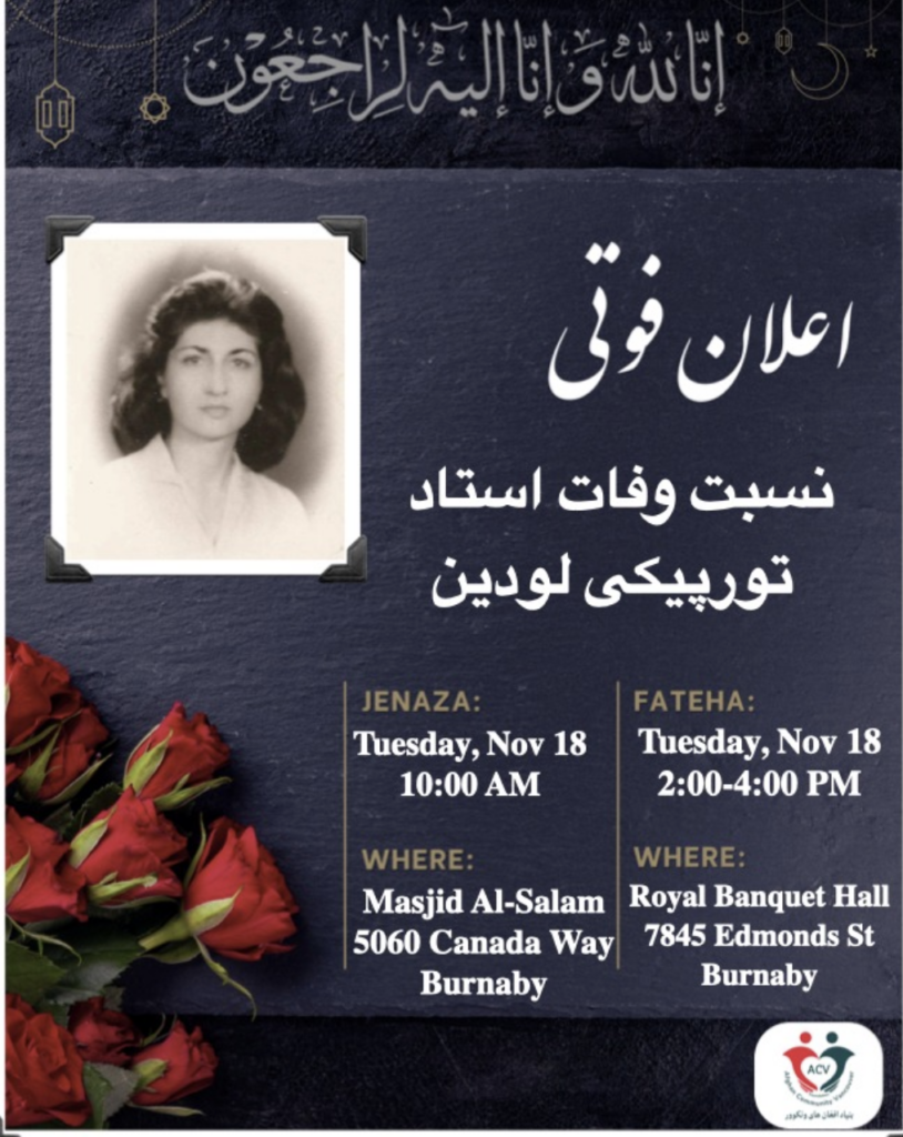 پیام کمونیتی افغانهایی ونکووراعلان فوتی احمدکبیر لودین شوهر، احمدسهیل لودین پسر، وکتوریا لودین عروس،جهانزیب امینی برادر، ملالی سیفی و گلالی حبیب خواهران،حبیب الاکبر شوهر خواهر،محمدمسعود