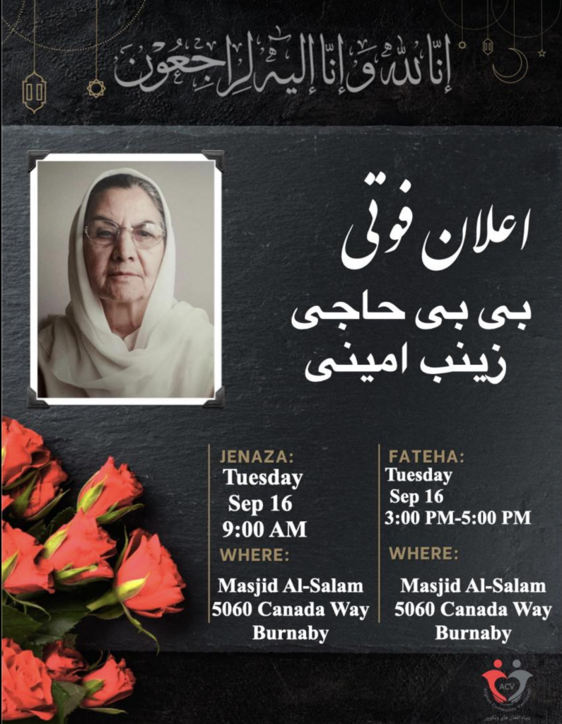 پیام کمیونیتی افغانهایی ونکوور اعلان فوتی ملالی سیفی، جهانزیب امینی، تورپیکی لودین و گلالی حبیب فرزنداناحمد کبیر لودین و انجنییر حبیب الاکبر حبیب داماداناحمد داور
