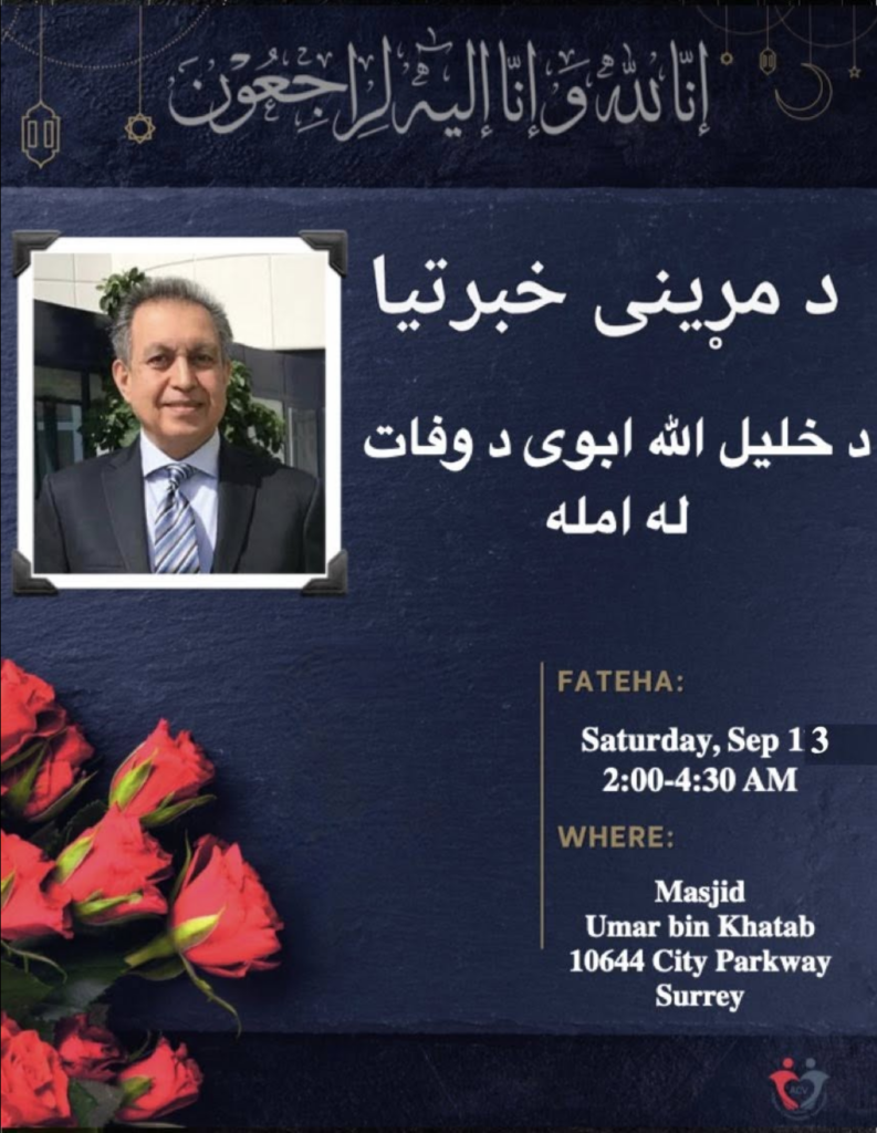 د ونکوور د افغانانو د ټولنی پیغام د فاتحی خبرتیا! مرحوم دوکتور خليل احمد ابوی د افغانستان د ملی شورا پخوانی رئیس، پلار، حمیدالله ابوی