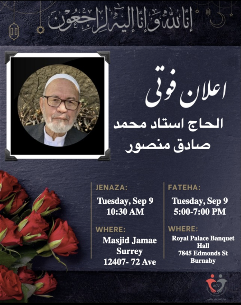 پیام کمیونیتی افغانهایی ونکوور اعلان فوتیبى بى حاجى مديحه منصور خانم، بى بى حاجى عاليه حسنى خواهر،وحيده منصور دختر،ضيا الله منصوراحمد مشتاق منصور، حاجى جمال
